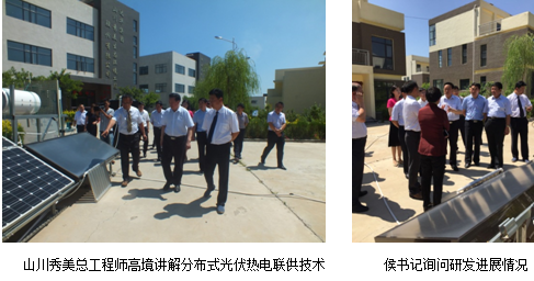 在眾人的引領(lǐng)下,侯書記來到了達華集團的展示區(qū)。首先迎接侯書記檢閱的是烈日下整齊排放的一排光伏板——這是達華集團自主研發(fā)的分布式光伏熱電聯(lián)供技術(shù),分布式供暖避免了供熱過程中的熱損失,在發(fā)電的同時又可供熱;低谷電價時,可將熱能儲存起來,高峰電價時再使用,這對張家口冬季嚴寒時期的城鎮(zhèn)和農(nóng)村居民供暖有著重要的現(xiàn)實意義。烈日炎炎之下,侯書記一邊忙不迭地擦汗,一邊耐心地聽完了此項技術(shù)的介紹,他頂著正午的大太陽,沒有絲毫的躲避之意,反而因為關(guān)心居民的冬季取暖問題,詢問起了這套設(shè)備在冬季的保溫溫度,他表示張家口冬季平均溫度在零下十多度,嚴寒時期可達到零下30多度,居民主要靠燒煤來取暖,如果能將這個技術(shù)完善提高,推廣應(yīng)用,那么既節(jié)約了能源,也改善了環(huán)境,是一件很值得鉆進去,攻下來的課題。